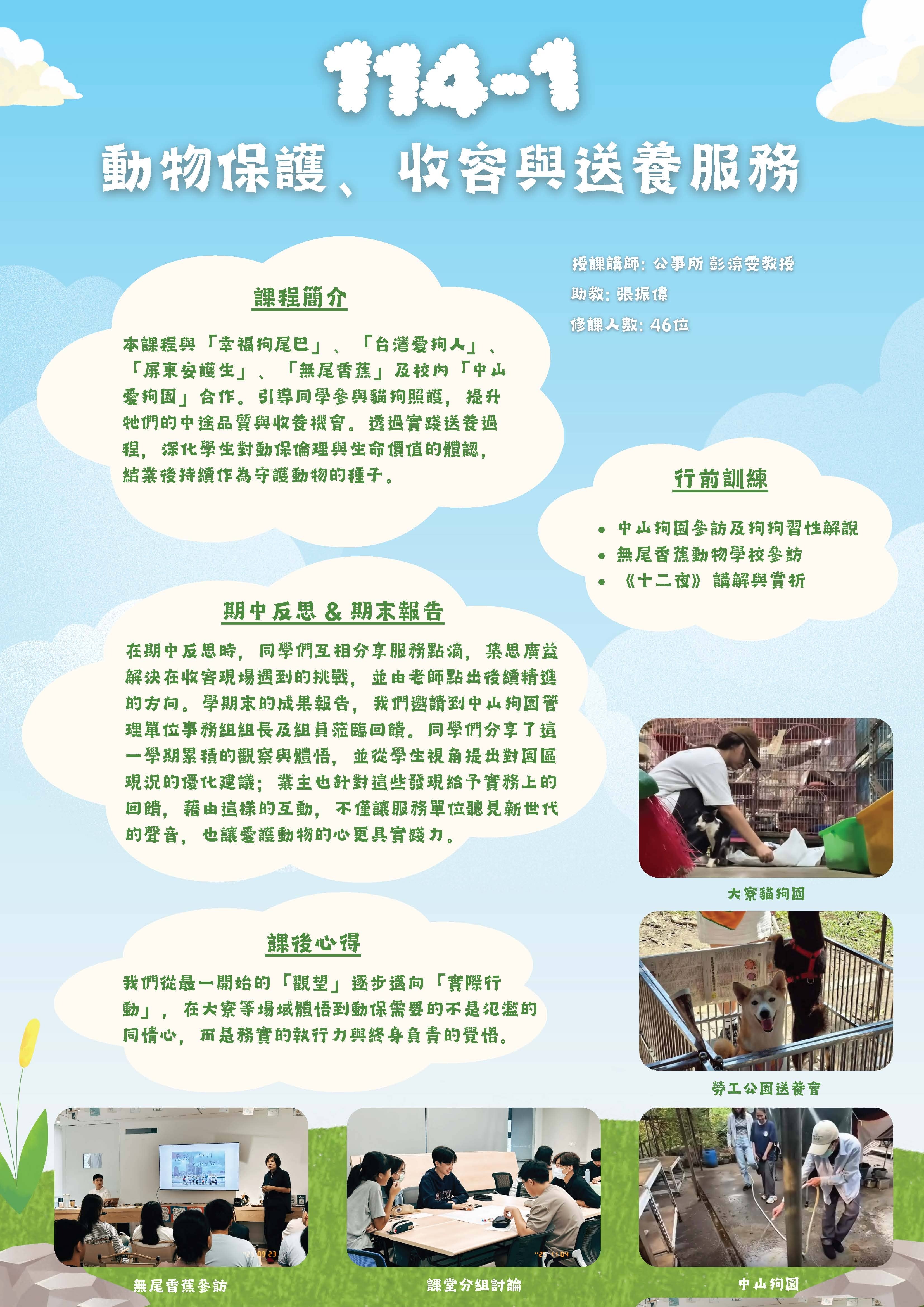 本課程與本校總務處管理之「中山大學愛狗園」,以及「幸福狗尾巴友善動物協會」、「台灣愛狗人協會」和「屏東縣立安護生協會」等合作,進行動物收容中心及送養工作的協助服務。希望同學在服務中不僅幫助照顧園區內的狗與貓,讓牠們有更好的中途生活與更高機會被收養,也實際了解送養過程和挑戰,加強同學們對於流浪動物、動物保護、動物倫理等課題的認識,深入體認生命的價值與意義,課程結束後依舊是動物保護的種子。