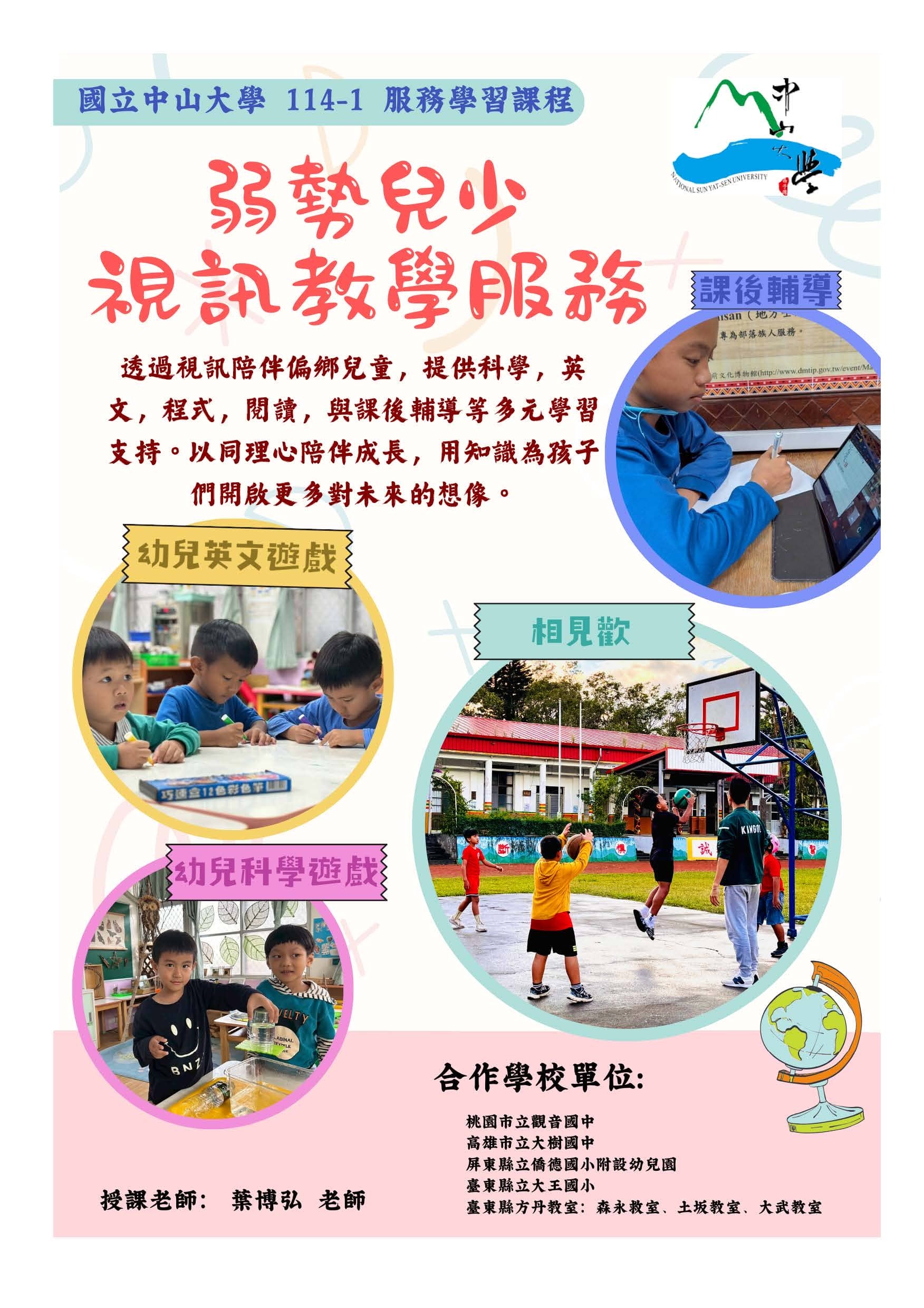 透過參與中山大學附設幼兒園活動並與園內幼童互動經驗,認識幼兒發展歷程,增進對人的尊重和體驗個人的成長。