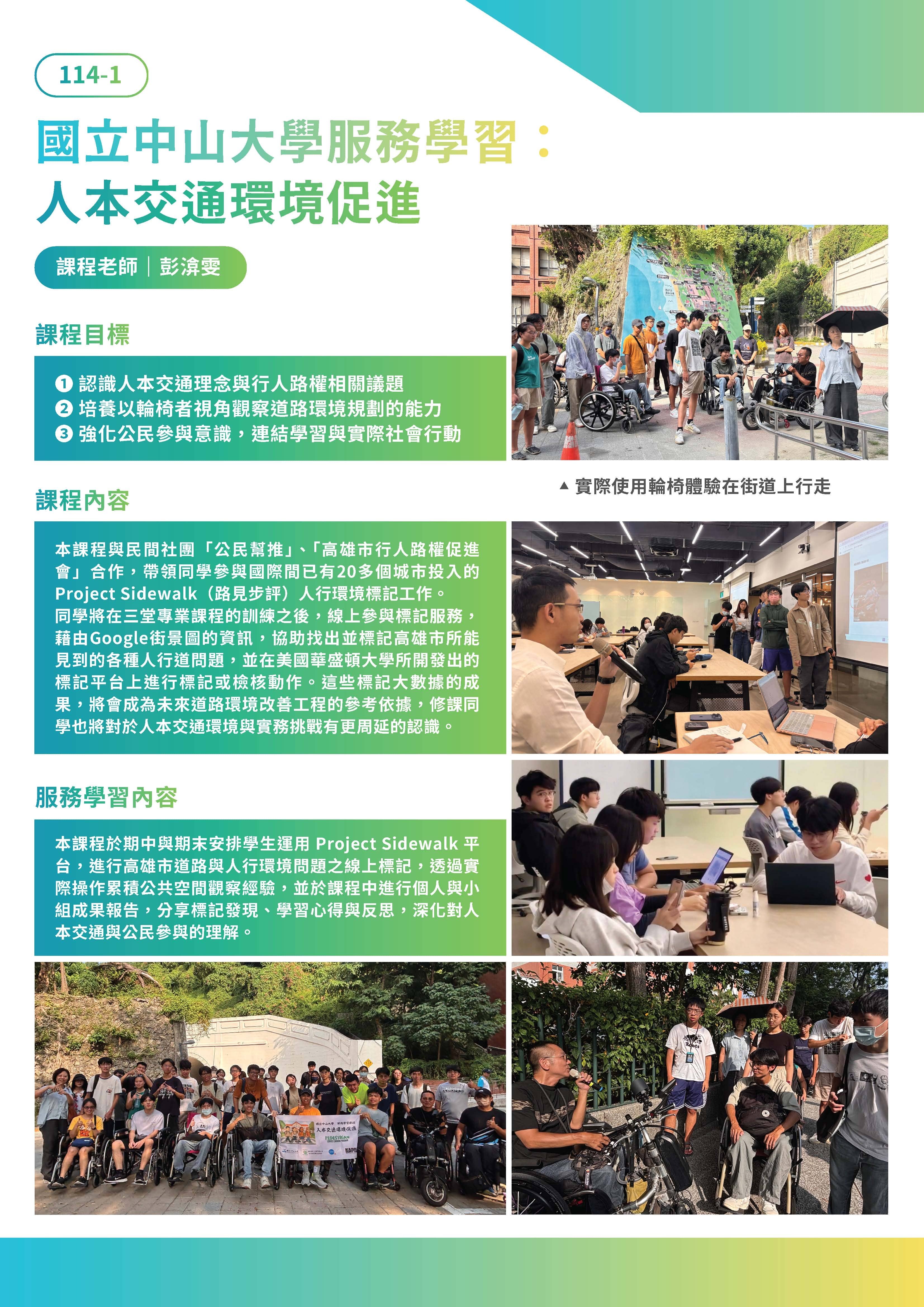 本課程與民間社團「公民幫推」、「高雄市行人路權促進會」合作,帶領同學參與國際間已有20多個城市投入的Project Sidewalk(路見步評)人行環境標記工作。