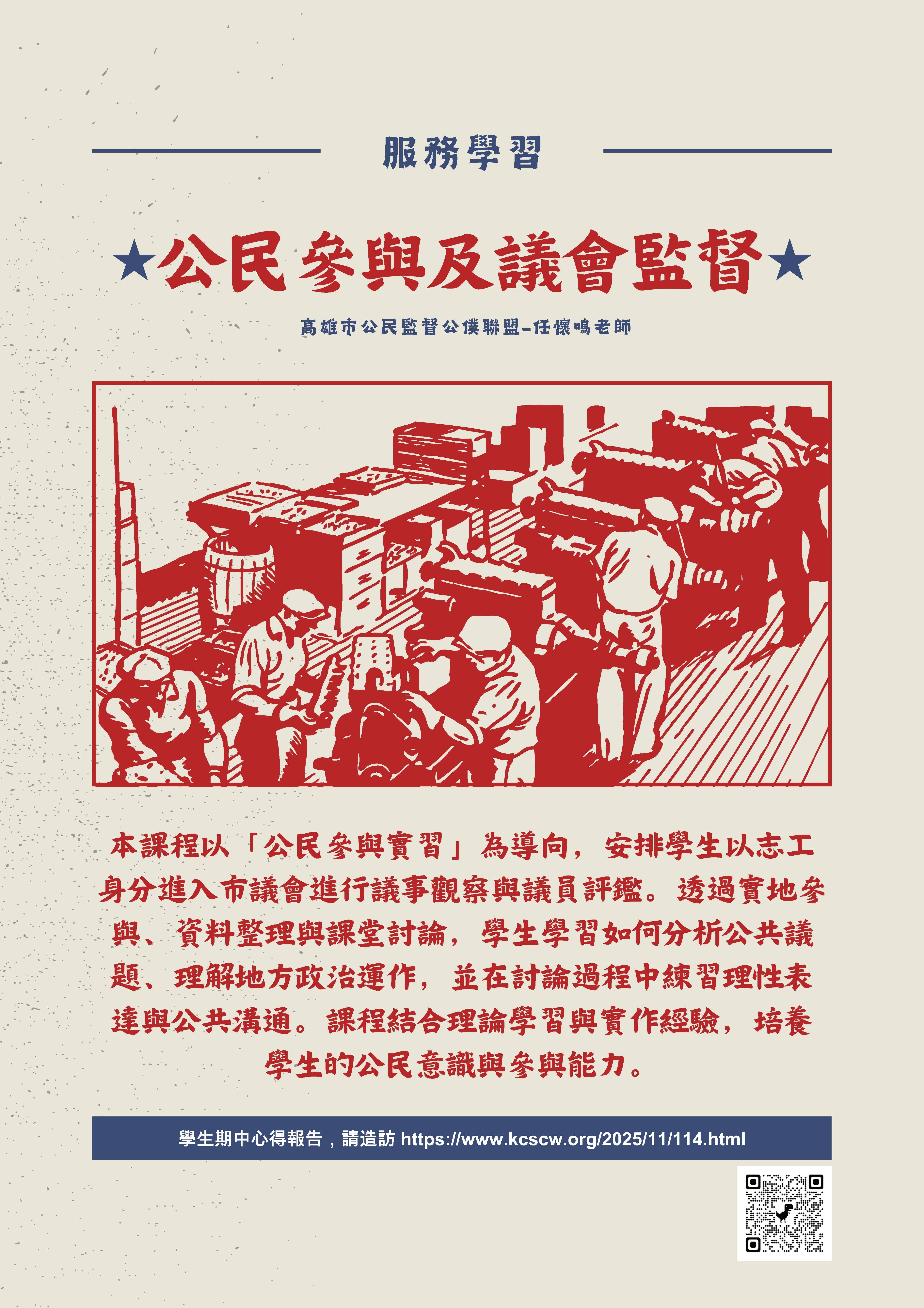 本課程與社團法人高雄市公民監督公僕聯盟(高督盟)合作,讓同學體驗「議員評鑑」以及「公民參與政府決策」的實際做法;希望在服務學習過程中,同學們能進一步體會民主的真諦,課程結束後能成為更成熟的公民。