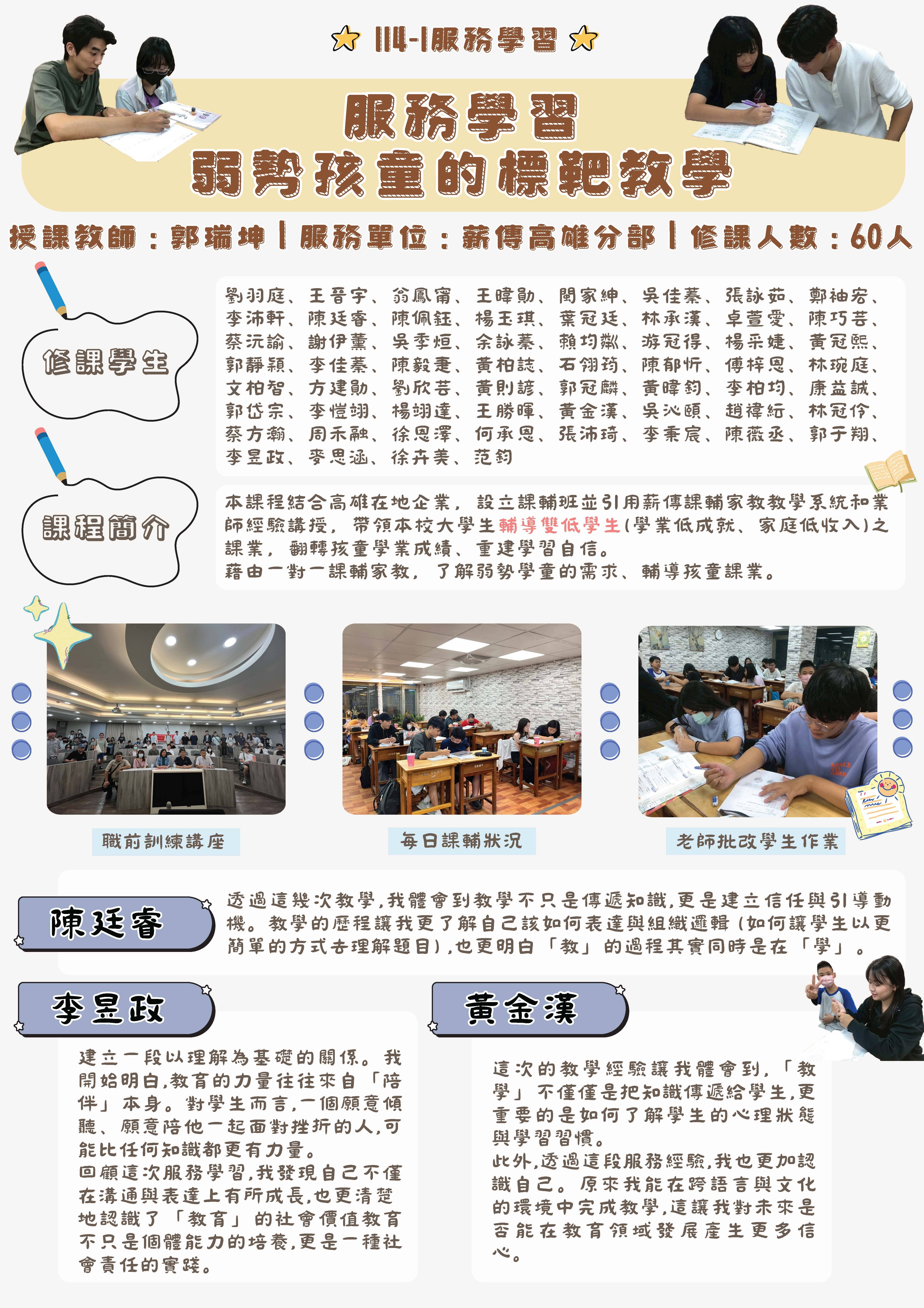 本課程旨在透過服務學習,培養學生對弱勢孩童的關懷與支持,課程結合高雄在地企業資源,建置課輔班並提供師生餐點,導入薪傳課輔家教教學系統及業師經驗傳授,帶領大學學生輔導雙低(學業低成就、家庭低收入)學童之課業,翻轉孩童學業成績及重建學習自信,期能引導學生在關懷同理、人際溝通、社會實踐等多方面獲得有價值的學習經驗。