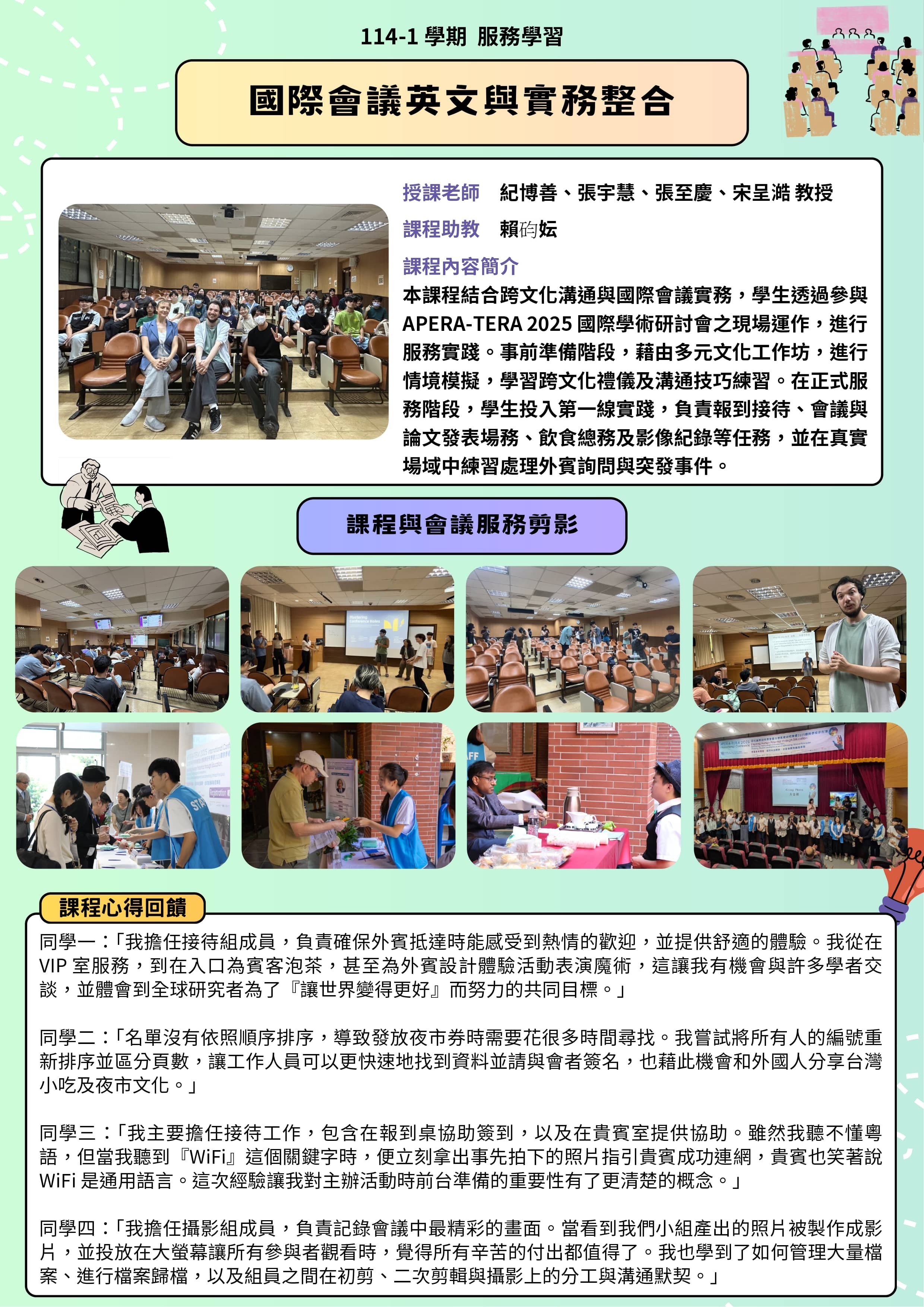 本課程結合跨文化溝通與國際會議實務,學生透過參與 APERA-TERA 2025 國際學術研討會之現場運作,進行 服務實踐。事前準備階段,藉由多元文化工作坊,進行 情境模擬,學習跨文化禮儀及溝通技巧練習。在正式服 務階段,學生投入第一線實踐,負責報到接待、會議與 論文發表場務、飲食總務及影像紀錄等任務,並在真實 場域中練習處理外賓詢問與突發事件。