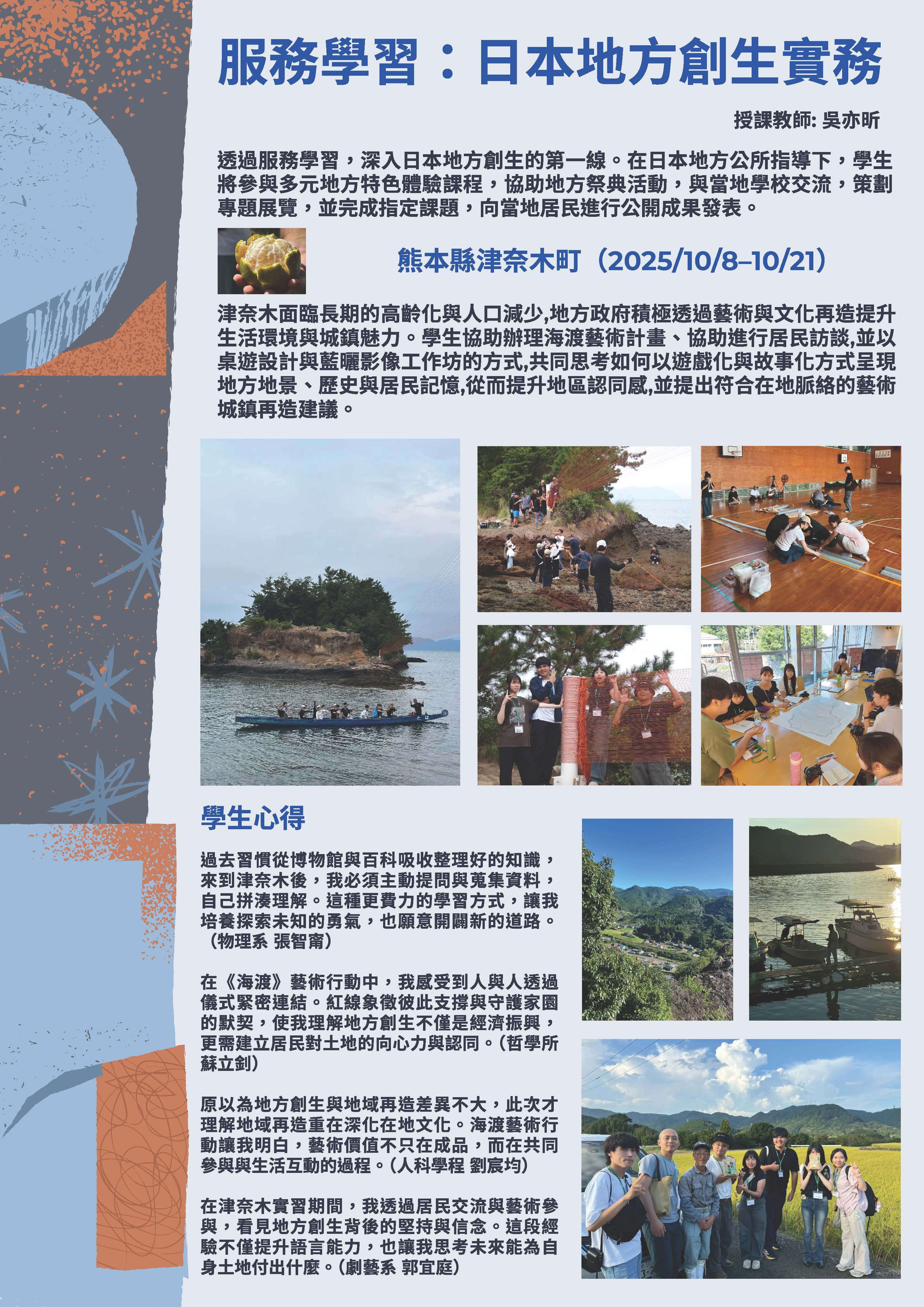 本課程旨在透過服務學習的方式,讓學生深入理解日本地方創生的概念與實踐,並結合日本地方公所所提供的資源與相關學者的專業知識。學生須從三個指定場域中選出一個做為服務學習地點,通過專題導向學習(Project based learning)的方式,出發前先在授課老師和接待場域的公所的指導下,針對該場域及該場域提出的專題任務進行事前調查與設計規劃,之後於暑假期間自費至現場進行10-14天的服務學習與專題實作,並進行統整,於服務學習期間結束時向當地居民公開發表成果。