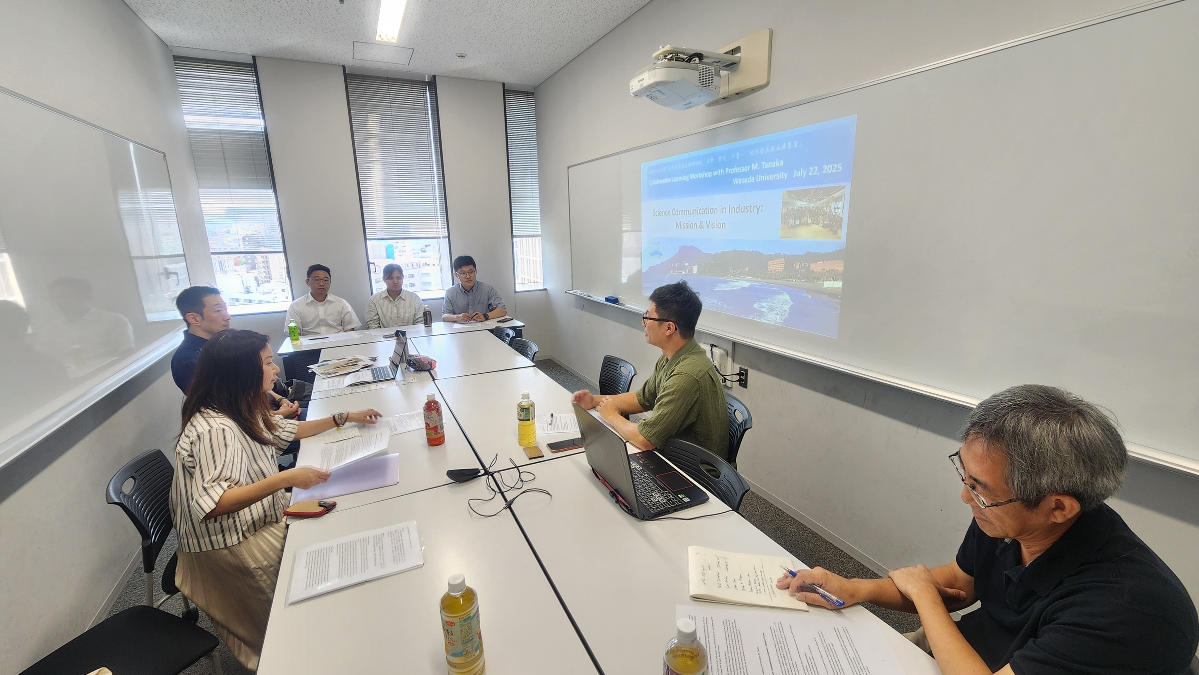 本共學行程接著到早稻田大學學習科學/風險傳播,舉辦兩日「產業科學傳播臺日經驗探討工作坊」,早大為日本科學傳播的研究重鎮,此行受到國際部副部長法學院Tetsuhito Motoyama教授、以及世界知名科學傳播學者,政治經濟研究所Mikihito Tanaka教授盛情接待,共學會議場地安排於早大之3號與8號館,並參訪理工學院校區,感受到其先進的校園空間設計,而在會後,我們也贈送台灣出產的高山茶與葛瑪蘭威士忌。兩位教授與大家分享許多科學傳播的議題以及案例分析,探討日本科學傳播專家,如何幫助民眾面對災害,例如:地震、海嘯、汞水事件、COVID19與疫苗等等,深入探討政府政策、訊息發布方式與影響等個案探討,Tanaka教授在疫情期間協助政府與民眾溝通,除了與我們分享諸多第一手經驗,也稱讚台灣抗疫歷程是學習的典範。三位博士生踴躍提問,特別是對當今年輕科學家,除了學術研究外,要如何與地方社群合作等,教授們也詳細回答,提供很多寶貴意見。值得一提的是,本次工作坊籌辦期間,正值7/5日本漫畫家的大地震預言沸沸揚揚,對於這個預言,子軒同學也詢問了Tanaka教授怎麼看待此事件,詢問一般民眾會因此對於地震、居住安全等議題更加關心,或者是造成恐慌呢?教授的回答是,的確偶而會有一些類似的預言出現並且迅速的被大家傳播開,但日本當局其實對於地震以及海嘯的防災推廣已行之有年,並且不斷的在更新民眾的防災觀念,因此大部分民眾可能不會有太大的恐慌,但是這些來自社群媒體並非正確的資訊,對兒童與青少年的心理健康影響,的確令人擔憂。兩位學者都強調,面對當今時事新聞與災害議題,的確都需要科學家與政府、與民眾攜手合作,共同面對地方與全球問題。