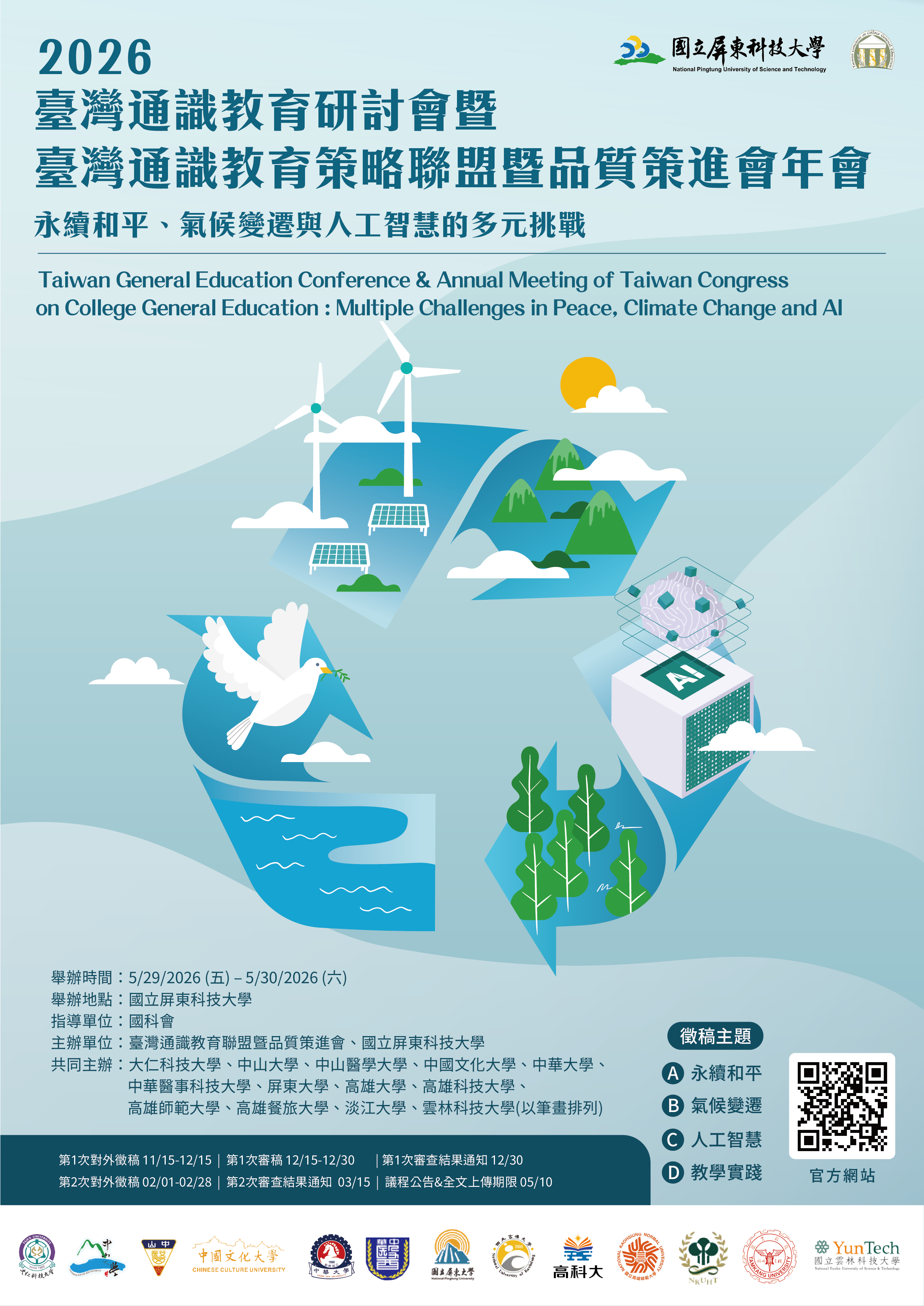 【研討會】「2026 永續和平、氣候變遷、人工智慧與教學實踐的多元挑戰通識學術研討會」(5/29/2026-5/30/2026)公開徵稿開跑!