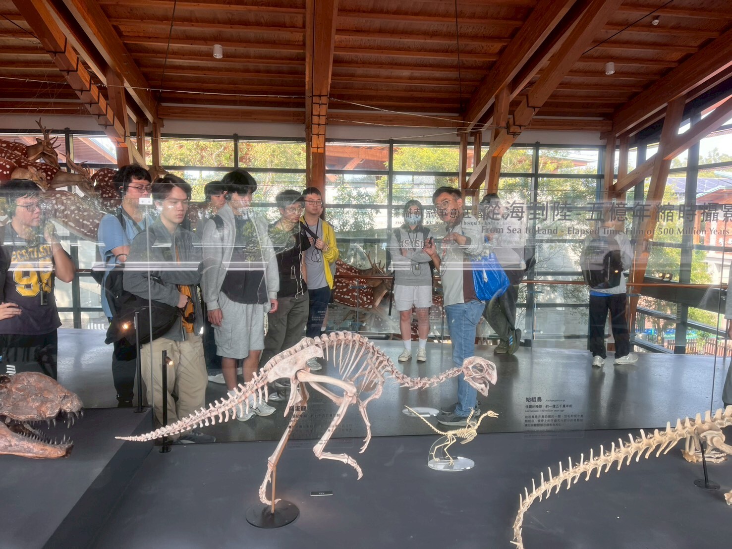 來自企管系的楊同學分享,展品中最喜歡的是形狀可愛的菊石,而最令他印象深刻的則是海洋生物主題中的孓遺生物「肺魚」,海洋生物是地球上最早演化的一群生物,當其親緣關係接近的類群逐漸滅絕時,僅存的物種便被稱為孓遺生物,肺魚同時擁有肺與腮,且自約三億年前存續至今,能在水族缸中親眼看到牠,讓同學感到十分震撼。同樣來自企管系的陳同學則表示,最令他印象深刻的是長達七公尺的巨大鱷魚化石,難以想像台灣的土地上曾經生活過如此龐大的生物,也讓他意識到自己對台灣自然歷史的認識仍有不足。